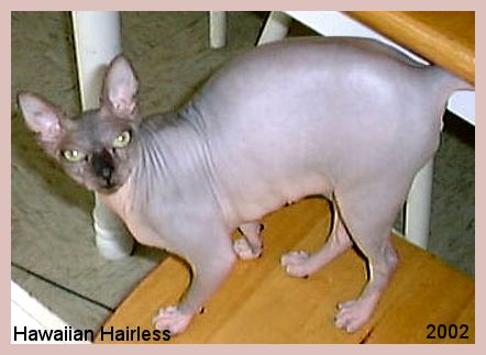 In 2002, the Hawaiian Hairless (or Kohana Kat) was reported. These cats were claimed to be the only completely hairless cats, since they lacked hair follicles and had a skin texture like rubber. The Hawaiian Hairless originated from a feral litter in Hawaii, and were allegedly due to a gene that masked out the dominant gene for full-coatedness. Unlike the other hairless breeds where the mutation affects the function of the hair follicles, this mutation allegedly caused the complete absence of hair follicles. There were other, unconfirmed, reports that it was the result of mating a Donskoy Sphynx to a Canadian Sphynx and the interaction of the 2 different genes. In 2010 it was confirmed by DNA analysis that the Kohana Kat had the same hairlessness mutation as the Sphynx, with other effects being due to other genes in the mix, and it was not a new mutation, but was a variation of an existing mutation. By this time the Kohana Kat had all but died out due to reproductive problems and other health issues that may have been due to inbreeding.