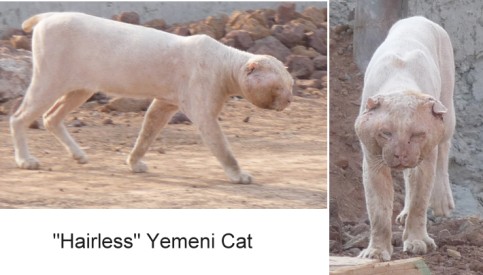 This is a hairless stray/feral domestic cat photographed in south-eastern Yemen where it was loitering on a building site and apparently chewing cable (a condition known as pica that is more common in Siamese/Burmese cats). It has a peach-fuzz of fur, with more fur on the extremities, suggesting a hairless mutation. The little colour visible (on the tail and near one ear) indicate it is ginger-and-white. The battle-scarred ears indicate a cat that has been in frequent fights; the puffiness of the face indicates a serious infection or tumours and the lack of fur/pale colour generally puts the cat at risk of skin cancer. The shortened tail could be a natural and relatively common bobtail mutation or the result of an injury. The puffiness around the eyes indicate further problems and the skin appears thickened which may be due to chronic mange or infection. All in all, the cat is in a sorry state.