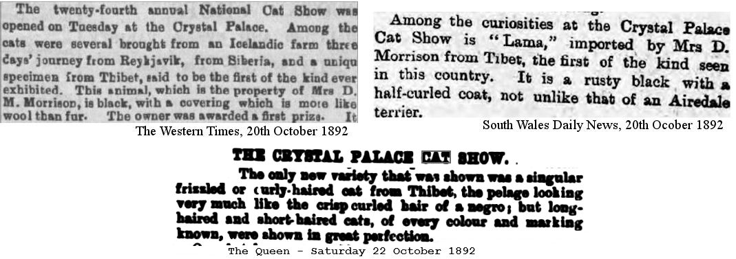 The "Thibet" cat imported by Mrs Mclaren Morrison appears to be the earliest account of a rex-coated (curly coated) cat. "A unique specimen from Thibet, said to be the first of the kind ever exhibited. This animal, which is the property of Mrs. D. M. Morrison, is black, with a covering which is more like wool than fur." (London Evening Standard, 19th October 1892). Among the curiosities at the Crystal Palace Cat Show is "Lama," imported by Mrs D Morrison from Tibet, the first of the kind seen in this country. It is a rusty black with half-curled coat, not unlike that of an Airedale terrier." (South Wales Daily New, 20th October 1892). "The Thibetan cat, never before exhibited is a curious black animal with a woolly coat, as different from the long silky hair of the English cat as a negro s crop is from a modern belle s." (Exeter and Plymouth Gazette, 20th October 1892). "The cat from Thibet takes a first prize, due, perhaps, to its rarity, for such a specimen has never been previously exhibited. It is black, and its coat is more like wool than a cat's fur." (Nottinghamshire Guardian, 22nd October 1892). "A very curious beast, says the correspondent of a contemporary, came from Thibet. There is a distinct species of cat in that country which is not domesticated, but this Thibet cat was simply extraordinary variation of felis domestica. It was long-necked and lean creature, with a grey black coat, the peculiarity of which was that it was just the texture of Irish frieze. " (Preston Herald, 22nd October 1892). "The only distinctly new variety in the exhibition was a cat stated to have been imported from Tibet. This was a small, dark, slate-coloured specimen with frizzy or curly hair very much like the short hair of a negro." (Illustrated London News, 22nd October 1892). Mrs Mclaren Morrison libed at Kepwick Park, Northallerton and imported and collected unusual cats. "Lama" (misquoted as "Lena" in some Crystal Palace reports) doesn't seem to have any recorded descendants. Possibly he never bred, or more likely his offspring were straight-coated. At that time cat breeders didn't understand recessive traits or that back-crossing offspring to the parent could recover those recessive traits.