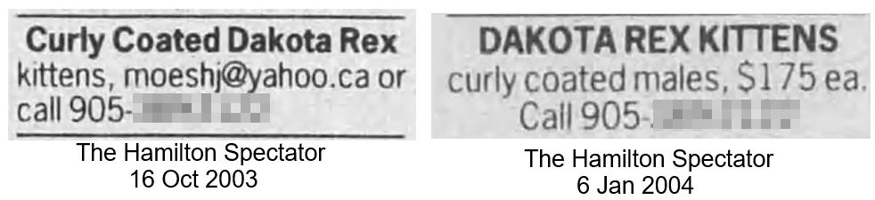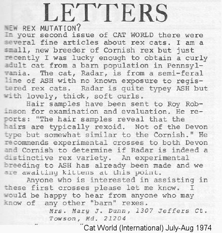 Mary J. Dunn (Towson, Maryland) described another spontaneous Rex when she wrote to geneticist Don Shaw via Cats Magazine in December 1973: "Enclosed is a hair sample plucked from mid-spine of what may prove a new Rex. The cat in question - named Radar-was born in a litter of semi-feral barn cats. The parents and known grandparents of the cat are straight haired. As far as can be determined, there has been no contact between this barn population and registered Rex cats. A pedigree of sorts is enclosed. Radar was one of three kittens in a litter. Two males were curly and the only female was straight haired and died of exposure at about five weeks of age. Radar is eighteen months old now and displays lovely ASH type. He just recently came to my cattery after a tragedy at his own home caused him to need another desperately. As far as it is known Radar has sired no kittens.