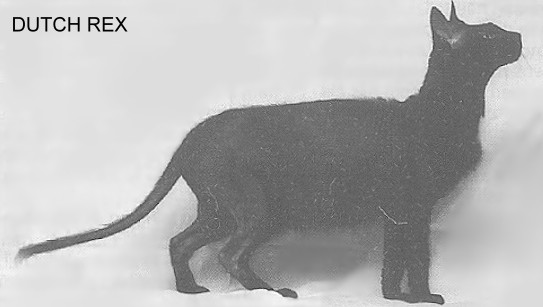 A Dutch Rex mutation appeared in Zaandam, the Netherlands in 1968. This mature female produced a rex daughter which bred with local normal-coated males producing further rex offspring. The rex daughter was then acquired by a cat breeder and her progeny were mated to unrelated straight-coated cats resulting in a mix of rexed and straight-coated cats. It was a dominant gene mutation and the hair tended to form dreadlocks. The coat ranged from wiry or springy to softer curls, but it was prone to balding in places and the unruly hair tended to become coarse as the cat matured. Some cats had bald backs and soft curly hair on the lower parts of the body. Others had bald hindquarters and longer, coarser, curly hairs one the forequarters. It was reported that the cats lost their curly fur if they bore offspring. The cats were bred for a short time, but the coats were always variable - one owner suggested it traced to an American Wirehair cat taken to the Netherlands by American military personnel. The slightly oriental conformation resulted from using Siamese outcrosses in the early 1970s. The Dutch Rex mutation was reported again in 1985, having a coarse wavy coat with a brittle texture and was also called the Wirehair Rex. Those reported in the 1980s were the offspring of the earlier Dutch Rexes. The last known Dutch Rex was an adult female found in the late 1990s on the streets of Amsterdam whose coat was closer to that of a rex cavy. She was never bred so no-one knows what gene she had. Apart from the 1990s female, whose origin was unknown, all of the Dutch Rexes could be traced back to the first mutant. The 1990s cat was initially believed to be a Blue Cornish Rex in poor condition, but was later recognised as a Black Dutch Rex. The dominant gene for Dutch rex produces a rex type of coat in the heterozygote and a very thin coat in the homozygote. All 3 hair types are thinner than normal and are crinkled.