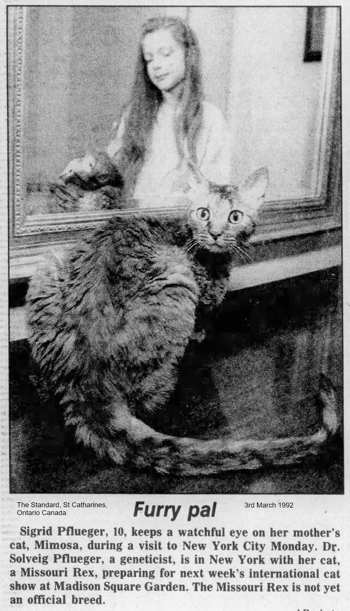 Shaw replied "Upon examining the hair sample from your cat Radar: 1) There appears to be a lack of guard hairs; if not totally lacking, they are definitely reduced in appearance, resembling awn or awned-down hairs, 2) These are relatively longer than those generally found in either the Cornish or Devon. 3) The modified awn and/or awned-down hairs are not as uneven and grossly abnormal as is typical of Devon. 4) They appear to be evenly curved, with smoothly changing diameter, yet more developed than in Cornish or German coat. 5) Not having examined hair from Oregon Rex, but going only on the description in Roy Robinson's' book Genetics for Cat Breeders, Pergamon Press, 1971, there appears to be a striking similarity. There seems to be no doubt that Radar is rexoid. Due to the apparent awn hair development, he is possibly phenotypically most like the Oregon Rex. Your present breeding to a totally unrelated white ASH and proposed back-cross should establish the probable recessive mode of inheritance. This is already markedly suggested since Radar is the result of very close consanguineous breeding (mother/son) of two apparently normal-coated individuals. However, the definitive breedings are to Devon and to Cornish and/or German Rexes to confirm or deny whether the genetic locus is new. Please keep us informed about Radar's activities."