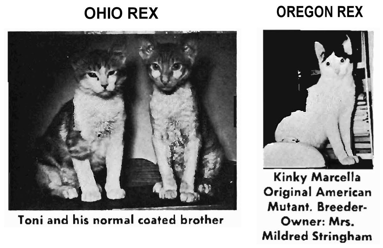 In the CFA Yearbook 1965, Helen Weiss wrote "In May, 1959 Mrs. Selby (Mildred) Stringham of Warrenton, Oregon, found a little black and white female with extremely short wavy fur, in a litter of otherwise normal kittens, born to her calico domestic cat. This kitten, named Kinky Marcella, was the original mutant of a new strain. Mrs. Stringham wrote to Mr. Jude, sending pictures and a description of her cat, who identifies her as "Rex" and advised that she be bred to a Rex male. Since Marmaduke was the only fertile Rex male in the country and he was in Texas, Kinky was bred to Mrs. Galvin's blue hybrid Rex [Cornish Rex/Blue Point Siamese], the result was five normal coated (blues and blacks) kittens, all males! Probably the Rex genes of the two strains were not compatable butthis of course could not be proven until such time as the Rex coated individuals could be bred together. Bred to one of the kittens from this litter, Kinky had a litter of four, two of which were Rex. We were entranced with these lovely kittens. Subsequent breedings have produced some very beautiful cats. Her work and the results of this work is fully described in February, 1964, issue of All Pets. "