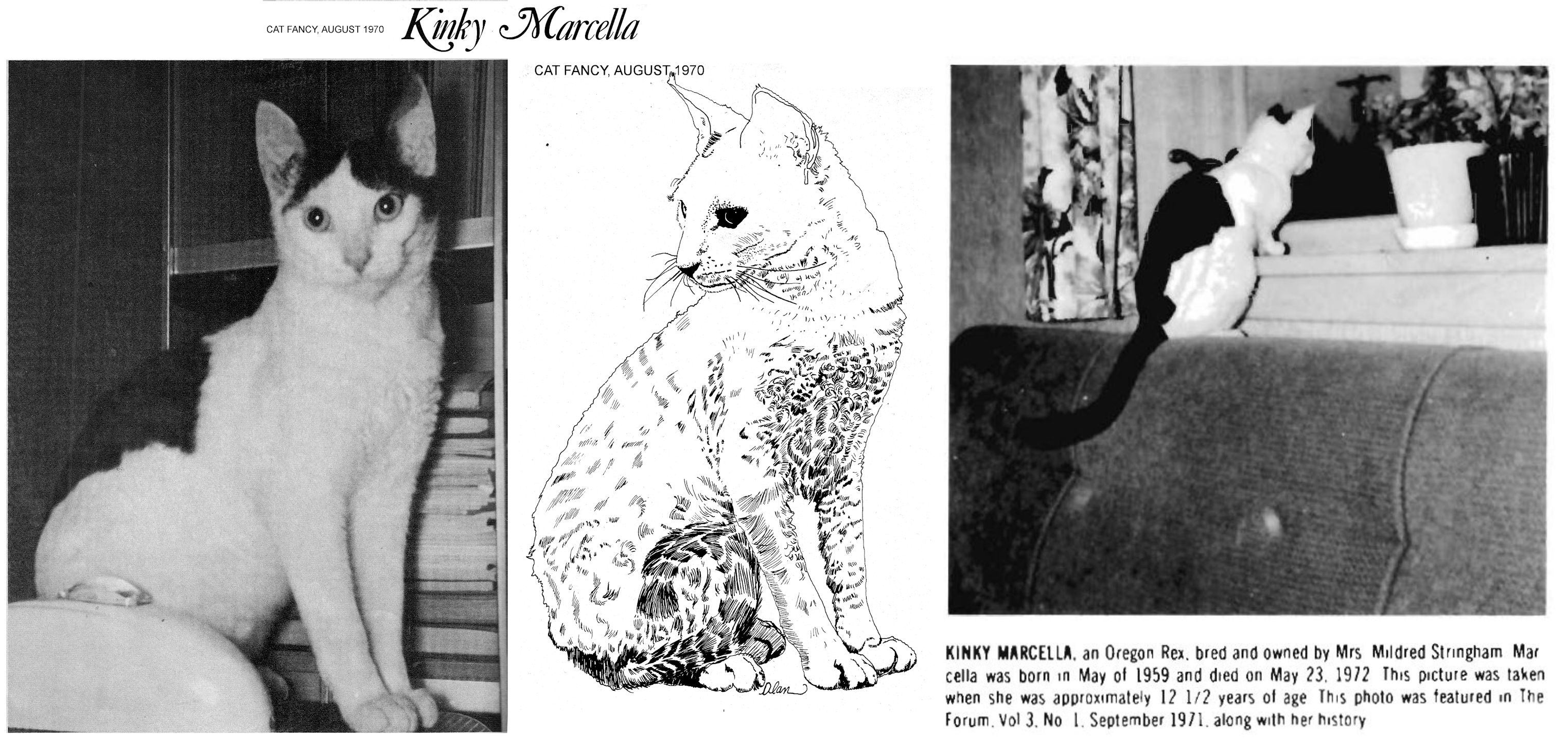 In the CFA Yearbook 1965, Helen Weiss wrote "In May, 1959 Mrs. Selby (Mildred) Stringham of Warrenton, Oregon, found a little black and white female with extremely short wavy fur, in a litter of otherwise normal kittens, born to her calico domestic cat. This kitten, named Kinky Marcella, was the original mutant of a new strain. Mrs. Stringham wrote to Mr. Jude, sending pictures and a description of her cat, who identifies her as "Rex" and advised that she be bred to a Rex male. Since Marmaduke was the only fertile Rex male in the country and he was in Texas, Kinky was bred to Mrs. Galvin's blue hybrid Rex [Cornish Rex/Blue Point Siamese], the result was five normal coated (blues and blacks) kittens, all males! Probably the Rex genes of the two strains were not compatable butthis of course could not be proven until such time as the Rex coated individuals could be bred together. Bred to one of the kittens from this litter, Kinky had a litter of four, two of which were Rex. We were entranced with these lovely kittens. Subsequent breedings have produced some very beautiful cats. Her work and the results of this work is fully described in February, 1964, issue of All Pets."