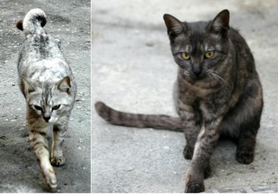Adele O'Shea took the following photos in the streets of Bahrain in February 2006. The silver female cat is not a typical Bahraini cat (she appears to have Persian blood) and has a curly tail. Her consort is a solid black male and their daughter is a smoke shorthair who has not inherited the curly tail (shown for comparison).