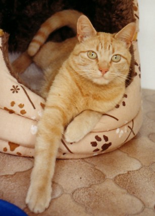 Ginger shelter kitty Byron had a tail that looped loosely over his flank. He wasn't too keen on showing it off when I took this photo.