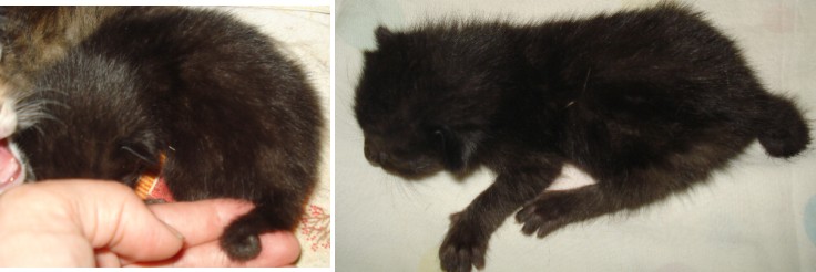 These photos from Lilleah West show a curly-tailed colourpoint kitten in July 2008, its mother and littermates. He can move the tail but not uncurl it; it curls downward and he holds it to the right. The photos show him as a newborn and a few weeks later.