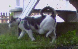 Sometimes nature produces a cat who seems undecided as to whether he is a bobtail with a longish tail or a curly tail with a shorter-than-normal tail! This is Erin Murphy's curly short-tailed cat, Chester. Chester and his sister were found as abandoned kittens. His sister had a normal Manx-type stumpy tail, but Chester had a short tightly curled tail and was initially considered "defective". Chester might be a bobtailed cat, showing the variability in tail-length which might be seen an can be seen in cats carrying the American Bobtail mutation. Chester's tail is perfectly smooth with no kinks or knots and it feels fluffy like a rabbit's tail. It is fixed in the tightly curled over-the-rump position pictured (i.e. he cannot straighten it) and the only movement he makes with it is a slight wiggle when playful. Due to his long back legs, rounded rump and general shape his owner feels that he is a Manx-type cat. Far from being defective, Chester is an attractive and possibly unique individual.