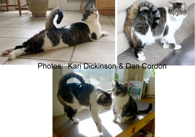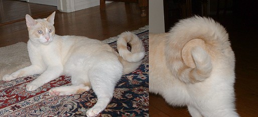 Slinky, owned by Rebecca Bushner, is a rescue kitty from California who now lives in Arizona with Rebecca. Slinky and his normal-tailed brother are now 3 and a half years old. Slinky's tail is like a corkscrew and goes in a complete revolution. He can wiggle the tip, but he can't uncurl it at all. There seem to be no ill effects from the tail. The photo shows Slinky's corkscrew tail in comparison with a normal-tailed cat.