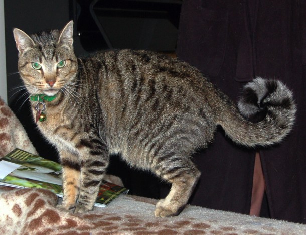 In 2006, Andrea Gee of Santa Ana, California wrote to me about her curly tailed cat Cobie. She obtained Cobie as a kitten. He was born on April 15, 2003 and was the only cat in his litter with a curly tail. His tail curled sometimes as a kitten, but by the time he was around 6 months old, it was curled all the time. He can put it down – and if he is sitting on a windowsill it may hang down flat. Most of the time it is curled, including when walking. He can move it around in any direction. If his tail is pulled down straight and it springs back into a curl when released.