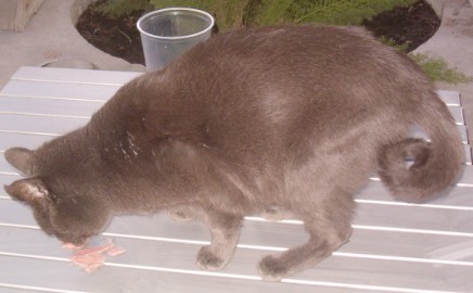 Michelle Kling, an American living in Italy, adopted 3 kittens. One of the kittens, named "Akita" (known locally as "Virgola"), developed a curly tail a few weeks before reaching 6 months old (December 2004). The kittens' mother comes from a colony of cats in the seaside port of Duino (near Venice). Akita is the first curly tail cat seen in the colony. An adult curly tailed cat has also been reported from one of the Greek Islands (it was not specified which one). Michelle sent this photo of Akita/Virgola, noting that she is the only cat in a local feral colony to have developed the curly tail. Michelle is one of the people taking care of the Duino colony In association with the Provinces of Trieste and Gorizia who supply food and health care for the animals.
