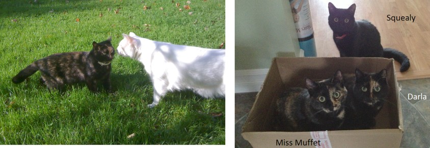 Darla does not meow or purr, and she communicated with her kittens using a barely-audible squeak. Two of the kittens are similarly silent, while the third is extremely vocal (hence named Squealy!). All 3 kittens inherited aspects of their mother's delicate bone structure (tiny feet, etc), but only one inherited the shortened, thick tail. All three quickly outsized Darla by 6-8 months of age. She is shown with her daughters in the fourth picture.