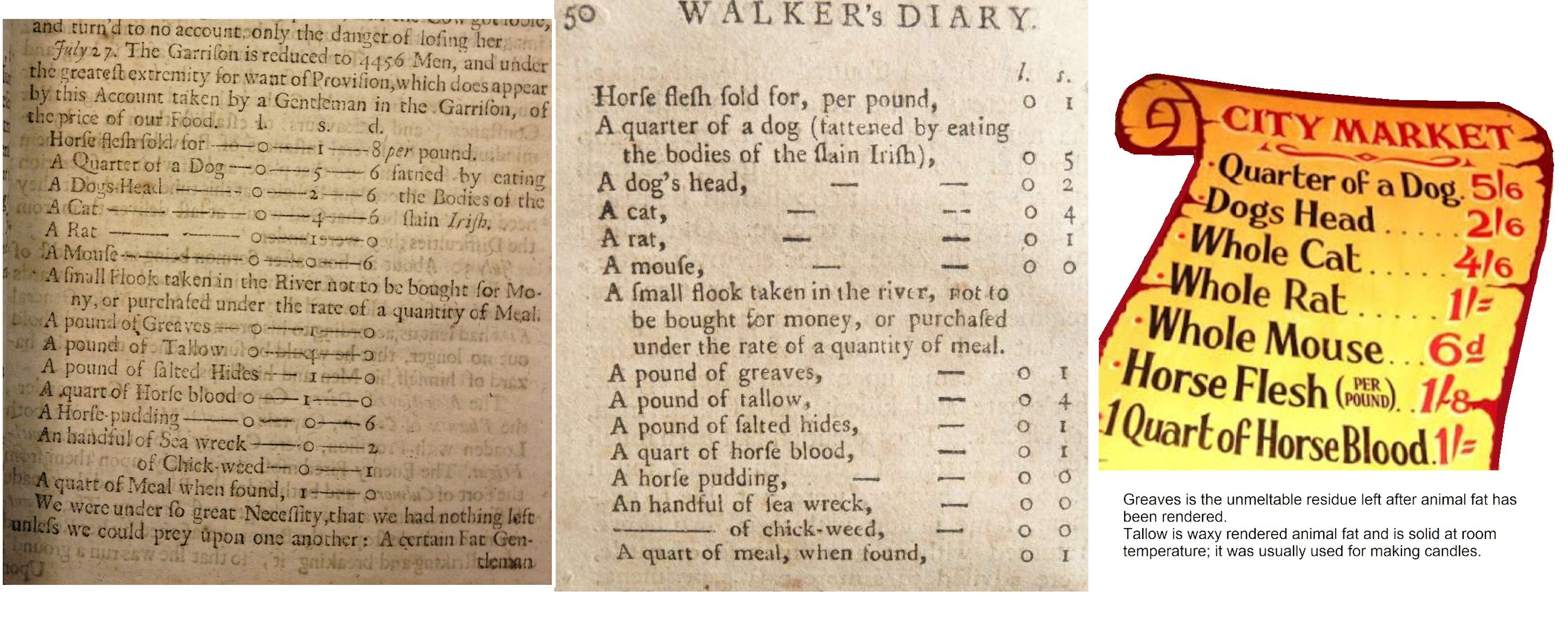 Graham’s play, based on that account, says: “The soldiers hunt up and down the city for dogs and cats, as cats do for mice. . . . Here is a list of prices in the meat market, if such it may be called; it was put into my hand this morning, by John Hunter of Colonel Stewart's Maghera regiment: Horse flesh, twenty pence a pound. A quarter of a fat dog, five and six pence. A rat from the church-yard, one shilling. A mouse, six pence. . . . The soldiers and starving citizens have eaten up all the dogs and cats in the town.”