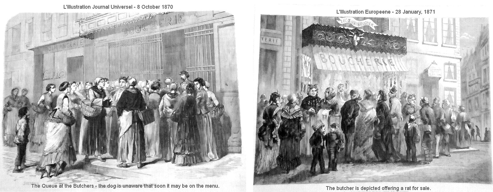 The Penny Illustrated Paper (29th October 1870) described some “Curious Food Experiments” caused by the siege of Paris. “An acquaintance of mine, invited out to dinner, ate part of an excellent rabbit, as he thought, and greatly enjoyed it. Next day his host had the hardihood not only to inform him he had been eating cat, but actually to show him other cats hanging up in the larder, and some more in the barrel all sorted for the siege. They had the advantage of costing nothing, being picked up casually from the street. This daring gastronomist was about to try dog, but hoped there to draw the line, and defended himself on the ground that his condition required meat, and that before long there would not be even horse at the butcher’s.”