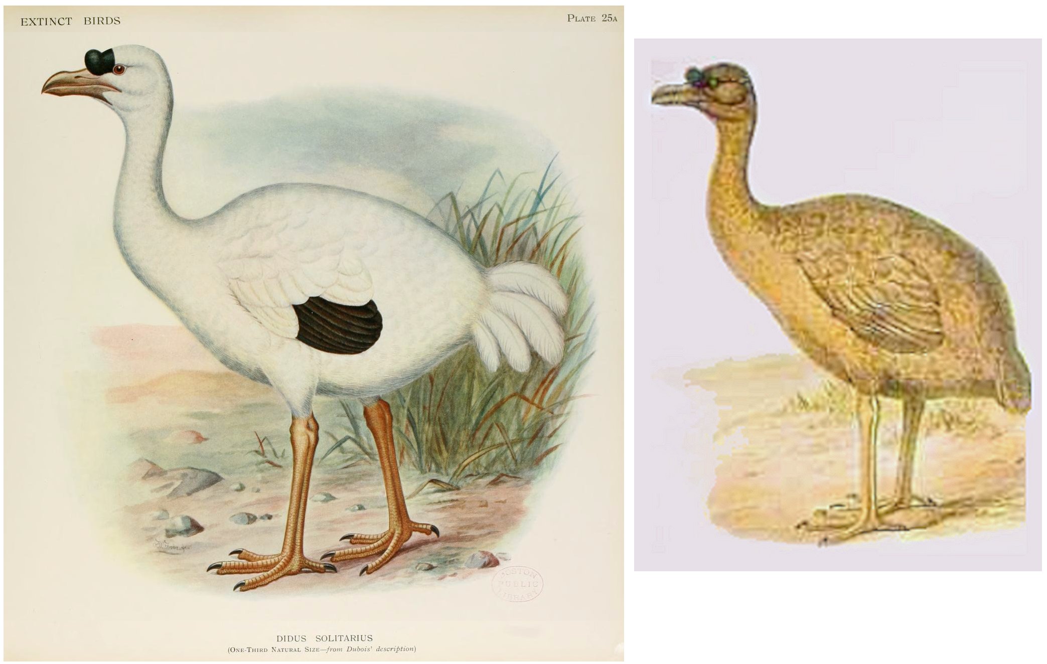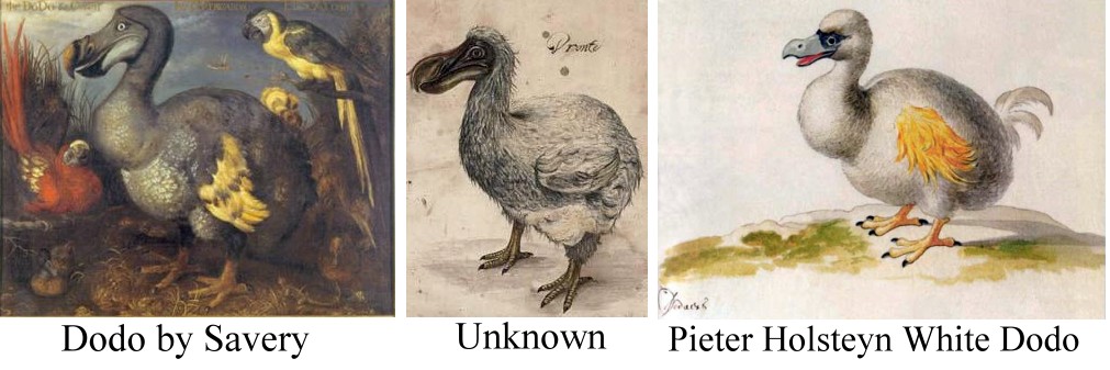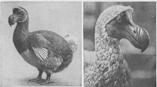 The Mauritius dodo (Common Dodo) became extinct in 1680. When first discovered, it was variously described as a wild turkey, a cassowary, a hooded swan, a booby or a bastard ostrich. It was actually a giant, flightless dove. Modern research and reconstruction suggest it was not as gentle and dove-like as once supposed; adult dodos could be aggressive, territorial and fight back. Far from being stupid and useless, it was well-adapted to its environment - an environment without mammals - and its demise was due to the introduction of predators it had not evolved to cope with. Its common name comes from the Portuguese "doudo" (foolish) and the Dutch "dodaarsen" (fat heavy bottom). Teelingly, the Dutch also called it Walghvogel (disgusting bird) alluding to its inedible flesh.