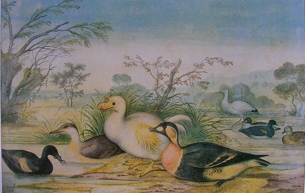 The Females are wonderfully beautiful, some fair, some brown ; I call them fair, because they are of the colour of fair Hair: They have a sort of Peak like a Widow's cap upon their Breasts, which is of a dun Colour. No one Feather is stragling from the other all over their Bodies, they being very careful to adjust themselves, and make them all even with their Beaks. The Feathers on their Thighs are round like shells at the end, and being there very thick, have an agreeable effect : They have two Risings on their Craws [Crop], and the Feathers are whiter there than the rest, which livelily Represents the fine Neck of a Beautiful Woman. They walk with so much Stateliness and good Grace, that one cannot help admiring and loving them ; by which means their fine Mein (i.e., mien) often saves their Lives.