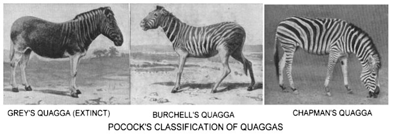 R I Pocock, writing in Harmsworth Natural History (1910), classed Burchell's and Chapman's zebras as quaggas while the species known today as the quagga was called Grey's quagga. He described numerous subspecies of quagga, many of which were merely pattern variations within a species. Pocock wrote: