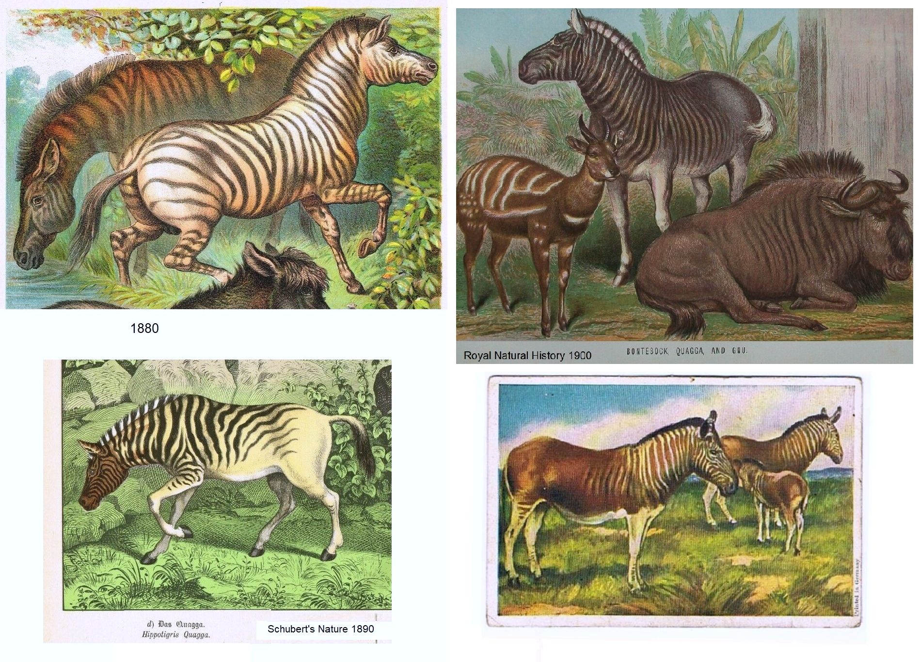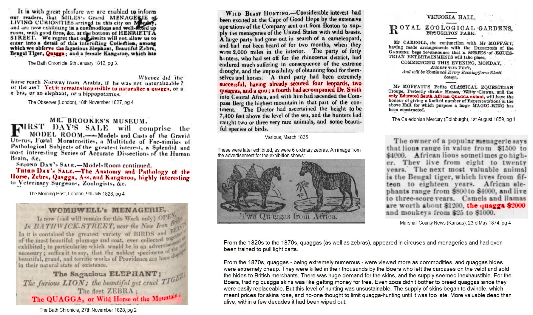 FASHION HAS KILLED THE QUAGGA. Ulster Echo, 14th December 1886, pg 4 (reprinted in various others in 1884 & 1885): “It is stated that the quagga, the beautiful wild striped ass of South Africa, has suddenly ceased to exist. The bootmakers of London and New York wanted his skin for a particular kind of sportsman’s boot, and he consequently passed away out of zoology. There may be a few left on the highest and wildest plateaus, but the Boers, tempted by the high prices, have extirpated the herds which only ten years ago existed in South Africa.”