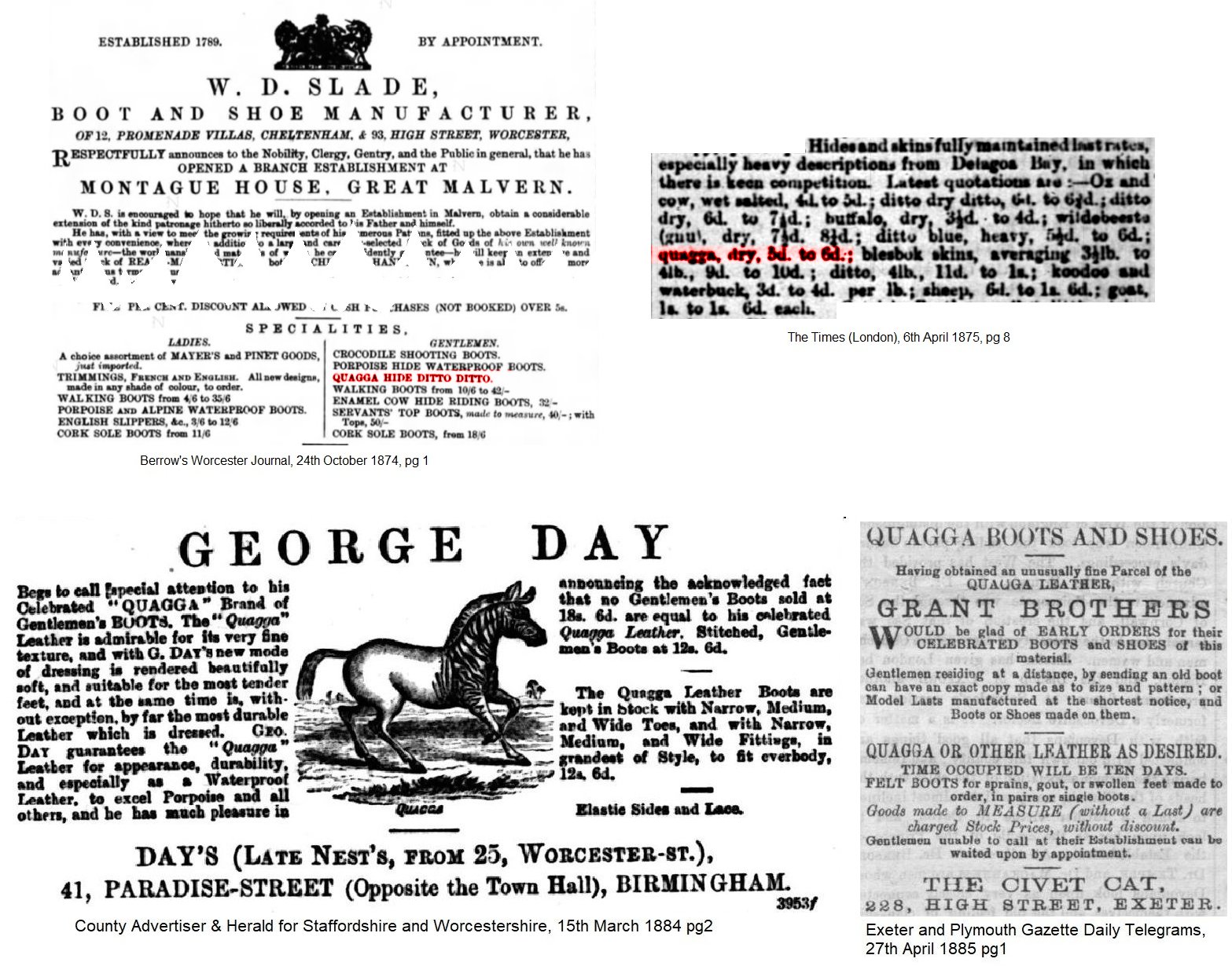 The commercial importance of the dead quagga is shown by the advert from 1884 in various British newspapers. For example: “George Day begs to call special attention to his Celebrated ‘QUAGGA’ Brand of Gentleman’s BOOTS. The ‘Quagga’ Leather is admirable for its very fine texture, and with G. DAY’s new mode of dressing is rendered beautifully soft, and suitable for the most tender feet, and at the same time is, without exception, by far the most durable Leather which is dressed. GEO. DAY guarantee the ‘Quagga’ Leather for appearance, durability, and especially as a Waterproof Leather, to excel Porpoise and all others, and he has much pleasure in announcing the acknowledged fact that no Gentleman’s Boots sold at 18s 6d are equal to his celebrated Quagga Leather.”