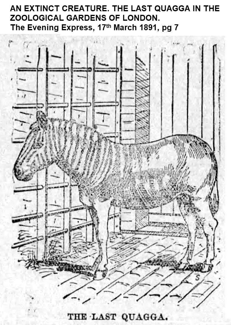 AN EXTINCT CREATURE. THE LAST QUAGGA IN THE ZOOLOGICAL GARDENS OF LONDON. The Evening Express, 17th March 1891, pg 7: “The frontispiece to the last Year-Book of Photography represents the last quagga which was to be seen in the Zoological Gardens of London, and which was photographed in 1873 by Mr. Frederick York, who now possesses five negatives of the animal. This quagga was received at the Gardens September 4, 1858; the date of its death there is unrecorded. The quagga is, or was, a native of South Africa, and nearly allied to the zebra. Quaggas were more readily tamed than the true zebra; in fact, in the early part of the present century, two of them were driven in Hyde Park by Sheriff Harkins. In length of ears and character of tail it more resembled the horse than the ass; still, to the popular eye the hinder half of the animal much resembled the ass, and the front half the zebra. It was heavier than the zebra, consequently was killed off more rapidly than is being the case with the zebra, by wild beasts, as the area in which such animals throve is being reduced by the extension of the limits of civilization. Supposing that any quaggas are still left, some ‘rich American’ might do worse than to offer a reward for their capture, and to start a quagga park.