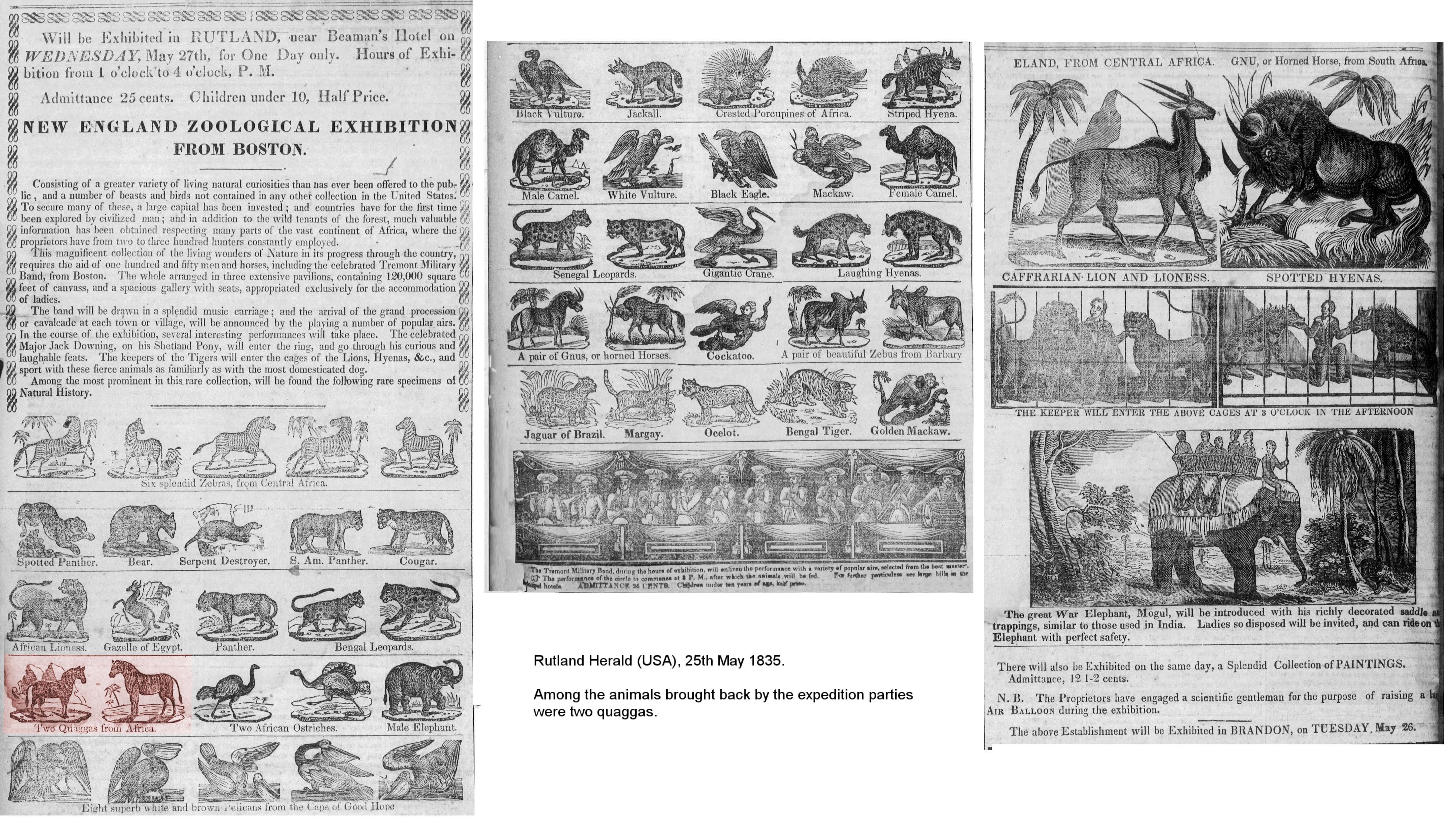 THE QUAGGA. Austin American Statesman, Texas, 3rd December 1872, pg 4. “[From the Cincinnati Commercial.] We mean to speak of an animal which would seem to be the very best substitute for the horse, if it be doomed to extinction. We refer to that excellent and elegant animal, the African quagga. Probably most of our readers know no more of the quagga than what they have learned by seeing its picture in the school geographies or in books of African travel. Many naturalists think that Africa was the original country of the horse, and there is very little doubt that it was in Northern Africa the horse was first brought under the subjection of man. In Africa, also, the quagga is found, and there in like manner, it has been domesticated. The quagga has the form, light figure and small head and ears of the horse. It is swift and strong, docile and obedient, and easily domesticated. It is capable of every variety of service performed by the horse, and naturalists say that by a little care on the part of man it might be rendered an exceedingly valuable beast of burden. It is about four feet high at the shoulders and neck, has slender legs and an asinine tail. It is an exceedingly beautiful animal. Its neck and fore parts are dark brown, elegantly striped with broad black bands; 1t has a dark line on the back; its hinder parts are light brown and it has white legs.