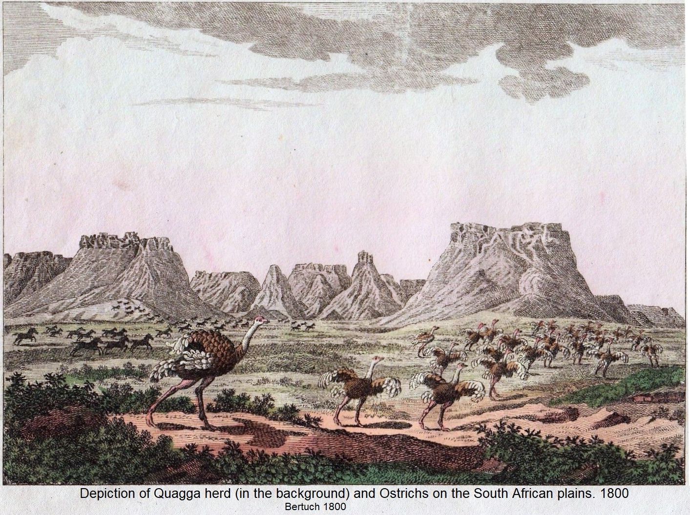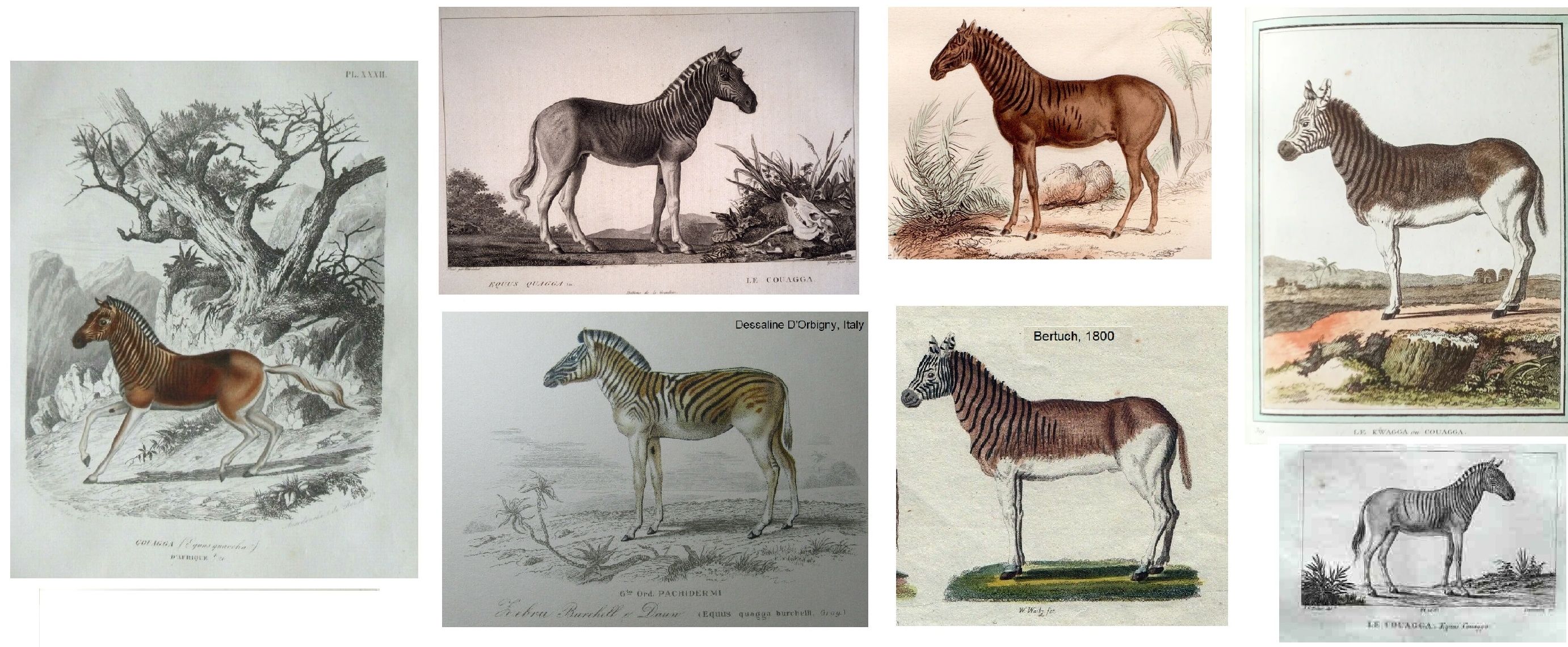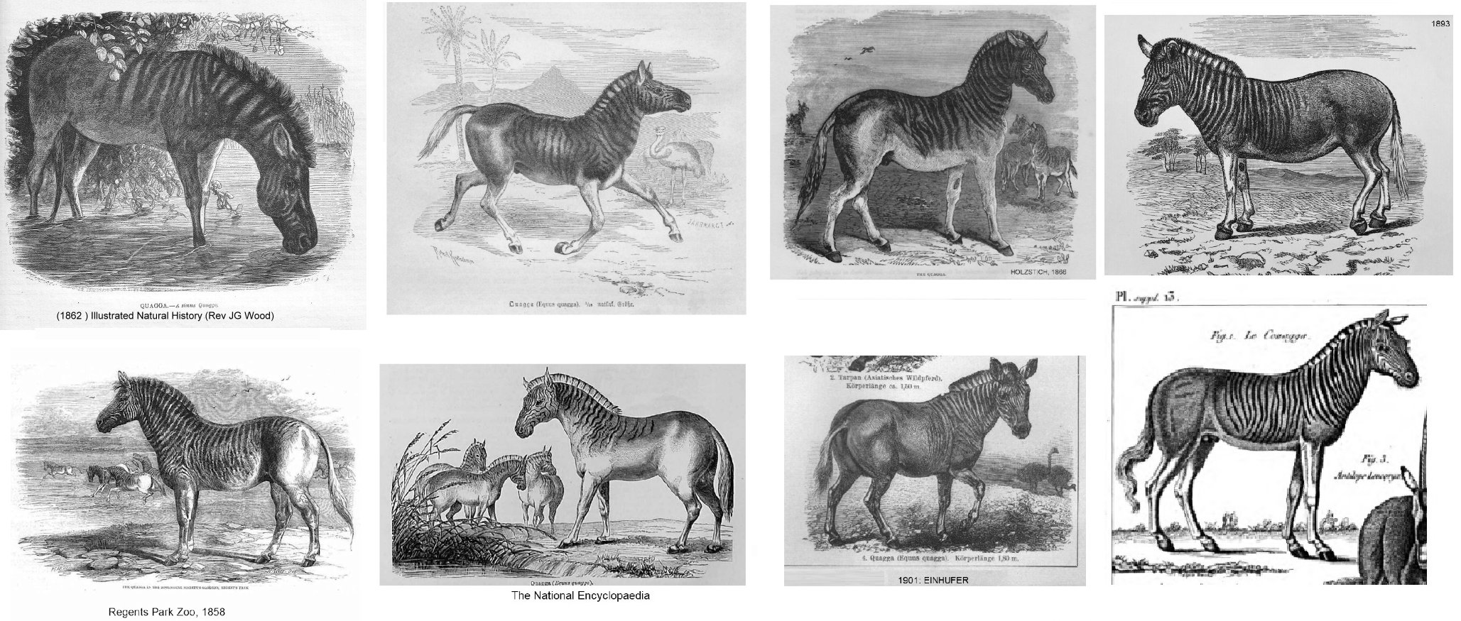 From Rev JG Wood’s “Illustrated Natural History” (1853, 1874): The QUAGGA looks at first sight like a cross between the common wild ass and the zebra, as it only partially possesses the characteristic zebra-stripes, and is decorated merely upon the hind and fore-parts of the body. The streaks are not so deep as they are in the zebra, and the remainder of the body is brown, with the exception of the abdomen, legs, and part of the tail, which are whitish-grey. The Quagga lives in large herds, and is much persecuted by the natives of Southern Africa, who pursue it for the sake of its skin and its flesh, both of which are in high estimation.