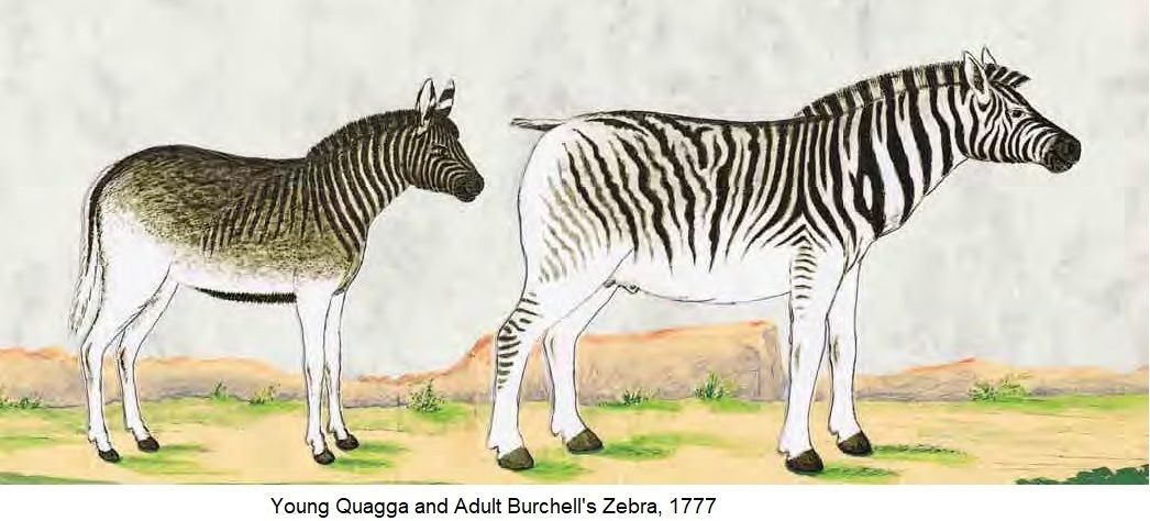 Burchell's Zebra was a subspecies of the Plains Zebra characterised by its unstriped legs and belly and its reddish brown body-stripes with paler "shadow stripes" in between on a cream or buff background colour. Its original range was mainly north of the Orange and Vaals Rivers, extending north into Botswana and the south-western Transvaal, and east to about Natal. It originally existed in vast herds, but by 1910 it was gone from the wild and the last known individual died in the Berlin Zoo in 1918.