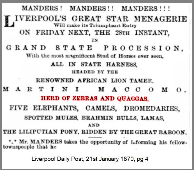 In January 1870, Manders’ Menagerie announced a Grand State Procession in Liverpool that included a herd of both zebras and quaggas. This is interesting because it distinguishes between the two animals. Quagga was still used as a synonym for Zebra, e.g. Chapman’s Quagga, Bonte Quagga. Unfortunately there are no drawings or photos, and because the public weren't familiar with the creatures, some circuses passed off zebrasses as quaggas. According to the Globe (17th January 1881, pg 2), Sanger’s Amphitheatre at Old Astley also boasted a quagga.
