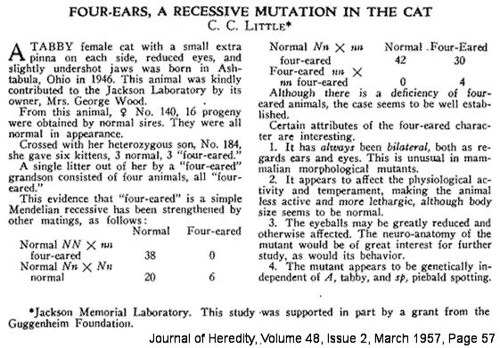 In December 1978 a cat with four ears was reported in Chattanooga, Tennessee, USA. The deformity was first studied in 1957 and is called, unsurprisingly, "four-ears" because the cat has a small extra pair of "ears" or at least extra ear flaps. In the cats studied in 1957, the eyes were reduced in size and the jaw was slightly undershot giving the head a peculiar shape. The kitten's growth and eventual size were normal, but the cat seemed to be relatively inactive and lethargic. Researchers believed that the functioning of the brain was also affected. The Four Ears trait is a recessive condition and therefore remains hidden unless a kitten inherits two genes for the trait. In a test-mating, two cats with four ears, when bred together, produced 100% four eared kittens - normal for a recessive gene - but the fact that it is so rarely seen suggests that kittens which inherit two genes die in the womb. (Little, CC. Four-Ears, A Recessive Mutation In The Cat. The Journal of Heredity, Vol XLVIII , March-April 1957, No 2 Pg 57 )