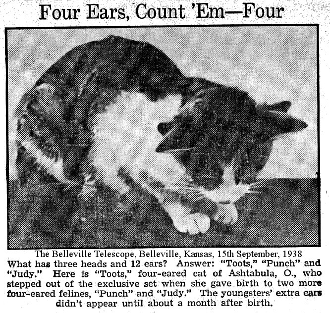 Another early report described Toots of Ohio, USA, also known as the Ashtabula Four-Eared Cat. The Belleville Telescope, Belleville, Kansas, September 15, 1938 reported 'What-has-three-heads-and-12-ears?- Answer:-"Toots," "Punch" and "Judy." Here is "Toots," four-eared cat of Ashtabula, O.,' who stepped out of the exclusive set when she gave birth to two more four-eared felines, "Punch" and "Judy." The youngsters' extra ears didn't appear until about a month after birth.' and the Shamokin News-Dispatch, Shamokin, Pennsylvania, Monday, November 28, 1938 wrote 'ASHTABULA, Ohio (U.R) Toots, the four-eared cat, may have her title as the only genuine four-eared cat voided and by her offspring, too. She has a son and daughter, Punch and Judy, who have two extra fuzzy tips alongside their regular ears.'