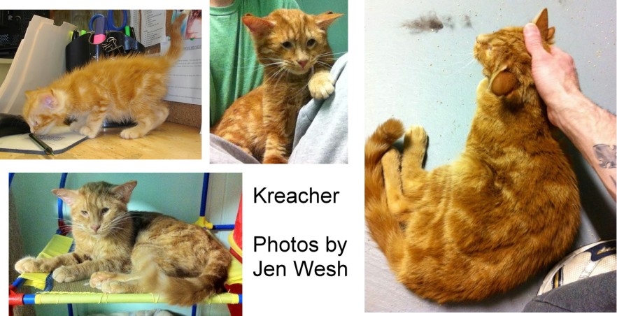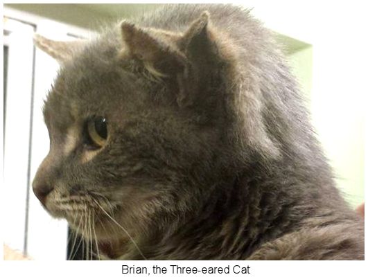 Jen Wesh (2013) of Joa's Arc Rescue, Audubon, New Jersey has a four-eared cat named Kreacher. Kreacher, who has his own Facebook page Kreacher the 4 Earred and Fabulous Cat , was born in southern New Jersey, USA, in the Spring of 2011. He was taken into the animal shelter at around 6 weeks old with his two completely normal siblings. Kreacher's extra ears are not functioning ears and are connected to an ear canal. His normal ears are rather large and his ear canals are long and thin and need regular cleaning. In addition to additional ear flaps, he has some other issues including juvenile cataracts, some facial deformities and paralysis, and he's very petite for an adult cat. This indicates that there are several causes of 4 ears in cats, with different side-effects. Kreacher's facial appearance and the conformation of his ears is similar to that of ginger Yoda. A three-eared cat was found in Norfolk, England in November 2015. He had strayed or been abandoned near a garage and was taken in by Feline Care Cat Rescue, in East Harling, Norfolk who named him Brian and is thought to be between four and eight years old. He almost ended up with a Star trek themed name because he has a left ear, a right ear and a final front-ear . Another 4-eared feline was reported in August 2016. A 3 year old black cat named Batman became an internet star after the four-eared feline was found at the Western Pennsylvania Humane Society shelter. Batman s second set of ears is said to be the result of a recessive genetic mutation. The condition has been documented since at least 1936, when a four-eared cat named Toots was found in Ashtabula, Ohio, according to the Western Pennsylvania Humane Society. Just hours after that news was announced, he was adopted by a family with a young daughter. In July 2021, the media reported a 4-eared polydactyl tabby cat called Aslan in Pennsylvania. Aslan has extra ear flaps behind his true ears. Swati Komanduri adopted Aslan who was rescued from a car repair shop along with several other kittens. The extra ear flaps are an unusual formation of the tissue at the base of the normal ear flap and Aslan also has the unusually wide-set ears of many four-eared cats. ABSENT EAR FLAPS In addition to multiple ear-flaps, some cats have been born with no external ear structures. This has been seen in a Persian cat and may have been associated with inbreeding for the modern ultra-type. The cat's middle and inner ears were intact and it was not deaf. Lack of outer ear affects a cat's ability to pinpoint sound - something cats do by swivelling their ear-flaps much like radar detector dishes. Many of the ear-less cats around are due to removal of the ear-flap because of skin cancer caused by over-exposure to strong sunlight (especially in pale coloured cats as these lack protective pigment).