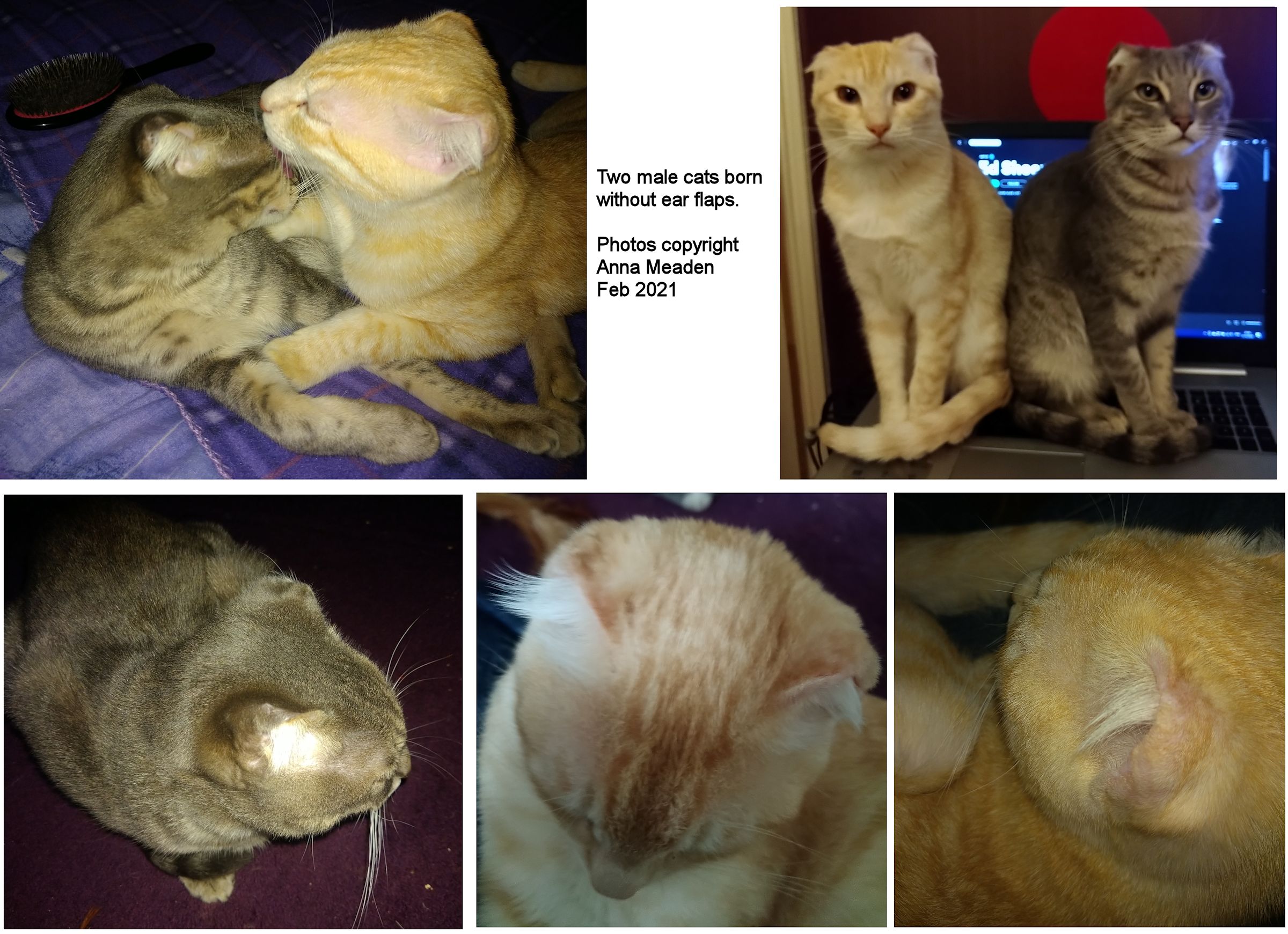 In February 2021 I received details of two brothers lacking ear flaps from birth. Anna Meaden adopted two brother kittens (about 9 months old) from Qatar. They don't have ear flaps apart from the base. The rescue took them in when their Mum who was a stray was run over by a car when the kittens were about 3 weeks old.