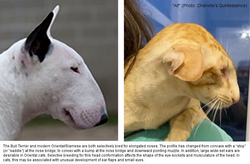 Ewa Enderleit in Denmark has a 4-eared cat called Joey. The vet believes this to be due to the mother, 2 year old Scottie, being given hormone tablets as no-one was aware she was pregnant until her single female kitten, Joey, was born on the night between September 1st and September 2nd 2003. A mummified foetus was later removed during spaying. LINK TO SELECTIVE BREEDING FOR LONG SKULL SHAPE It is possible that some of the "extra ear flaps" are strange folds and may be linked to selective breeding for large ears and for how ears are positioned in Oriental breeds. They are bred for the long skull shape and this will affect structures of the skull and face e.g. unusual ear flaps, small deep-set eyes. Selective breeding has changed the shape of Persians and introduced structural changes, this might be a similar thing in Oriental breeds due to selective breeding for changed skull shape. Similar changes are found in the Bull Terrier. Alfie is a 4-eared Oriental cat from Chanelle's Quintessence. This is his breeder s description: When he was born, we were shocked, in the full sense of the word. Never, from the word at all, have I heard of or seen anything like this. This kitten was distinguished from the rest not only by an extra pair of ear shells, but also by an extremely long body, and the shape of a head resembling that perfect drop from a sci-fi films, and its eyes were extremely small. It was clear that we were encountering a mutation, but unfortunately, no information was found about it, except that 4 ears pull reduced eyes behind them. To date, we have 3 such kittens growing up in our nursery. So I will briefly share with you my observations. 1. These kittens have a very long nose, a long body, a long neck. The Bull Terrier and modern Oriental/Siamese are both selectively bred for elongated noses. The profile has changed from concave with a stop (or saddle ) at the nose bridge, to convex with a bump at the nose bridge and downward pointing muzzle. In addition, large wide-set ears are desirable in Oriental cats. Selective breeding for this head conformation affects the shape of the eye-sockets and musculature of the head. In cats, this may be associated with unusual development of ear flaps and small eyes. A ROUND-UP OF RECENT CASES In March 2004, a six-month old cat with four ears was put up for adoption at an animal shelter in Murnau, southern Germany. Lilly was born on a farm in Bavaria and has an extra pair of slightly smaller ear-flaps behind her normal ears. This unusual trait is a rare gene mutation; the extra ears do not have any hearing ability. The front ears are completely normal. None of Lilly's littermates were affected. Many farm cats in the area are not neutered. Lilly has since been adopted by a family who already had cats from the same shelter and who did not intend to exhibit her as an oddity.