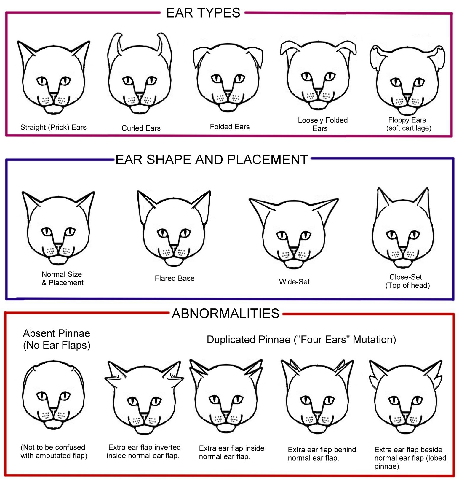 As with many physically similar traits, there may be several different genetic mutations. The Chattanooga and 1957 cats may have had a different deformity to more recently reported four-eared cats which are otherwise normal. Alternatively, there may be a single mutation with variable expression - different degrees of deformity ranging from cosmetic through to damaging. In humans, there have been cases where extra auricles (earlobes) were present below the normal ear but did not have an ear canal. reported forms are: additional "lobes" to ear flaps, additional ears not connected to normal ear flaps. The exact placement/alignment of the additional ears may also differ.