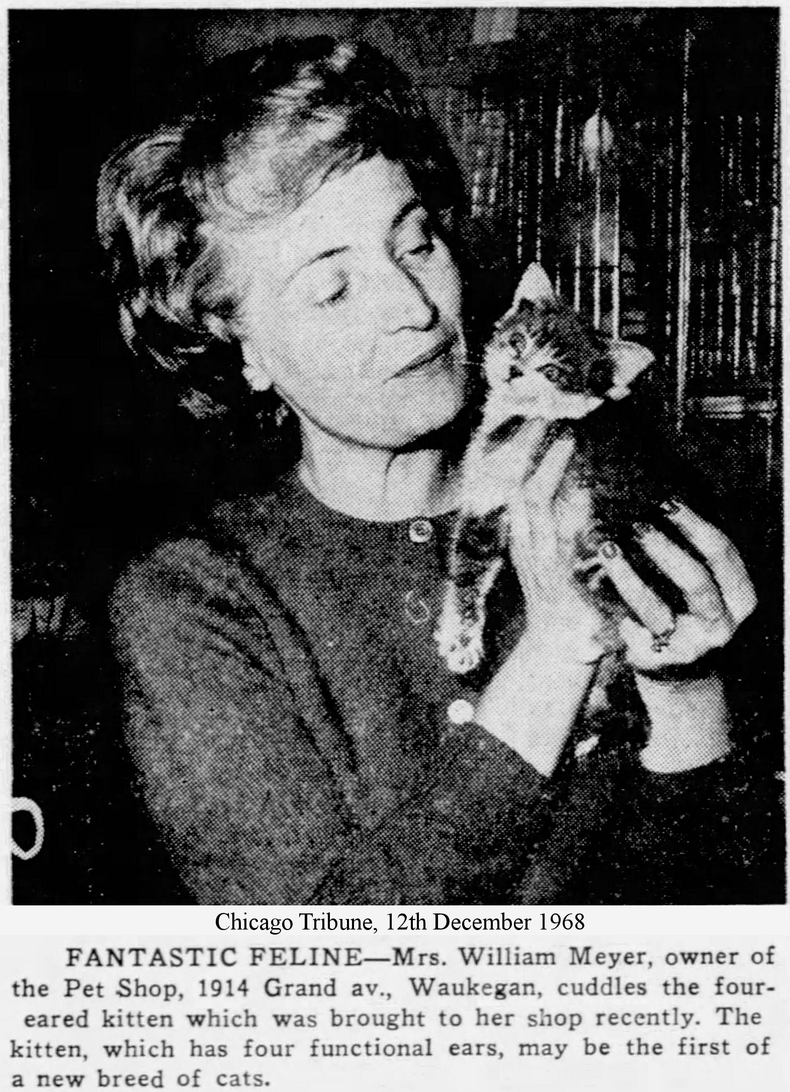 Another four-eared kitten was reporetd under the headline IF IT COULD HEAR YOU TALK, CAT MIGHT SAY ALL THE BETTER TO HEAR YOU WITH in the Chicago Tribune, 12th December 1968