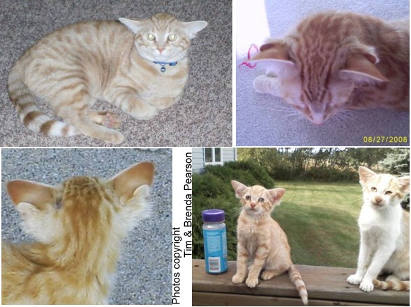 This 4 eared cat is tabby-and-white Gizmo from Lafayette, USA whose story was released on October 19, 2004. He was a barn cat, probably descended from dumped cats, and was rescued by the Bowen family. His intriguing deformity is probably due to extensive inbreeding according to Dr. Sharon Ellman-Murray, DVM. Gizmo has been adopted as NCISN poster kitty promoting responsible spay and neuter to prevent overpopulation. Although Gizmo's deformity is endearing and not harmful, inbreeding can lead to more serious problems. Gizmo's photo and information were kindly provided by Dr Sharon Ellman-Murray. Unlike the other 4-eared cats shown here, Gizmo's extra ear flaps appear to be inside his normal ears and facing in the opposite direction. The additional ears do not have ear canals associated with them. Following a veterinary exam, Gizmo was reported to be completely normal in all other respects and has a normal sister. He is active with no sign of mental retardation.