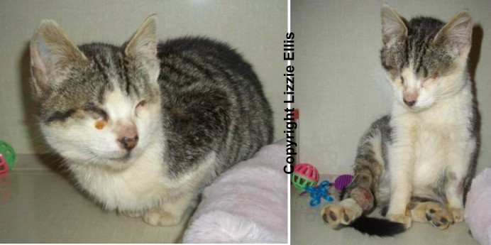 Lizzie Ellis (The Feline Rescue Association Inc, Maryland, USA) provided these photos of a kitten named "Fox." She looks like she has anophthalmia, due to the sunken appearance of the eye sockets, but she does have tiny eyeballs in there and seems able to see at least a little bit.