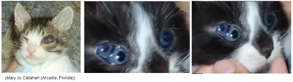 Mary Jo Callahan (Arcadia, Florida) provided this photo (below) of her 50 day old kitten, which looked as though it had both eyes in one socket. One socket is empty, but the other has an enlarged, deformed eyeball present. Unfortunately, this would require a vet to determine whether the deformed eyeball is causing distress or provides vision, or is likely to continue expanding due to build of pressure within the eyeball. If it caused distress, the eye would have to be removed leaving the kitten blind, but more comfortable.