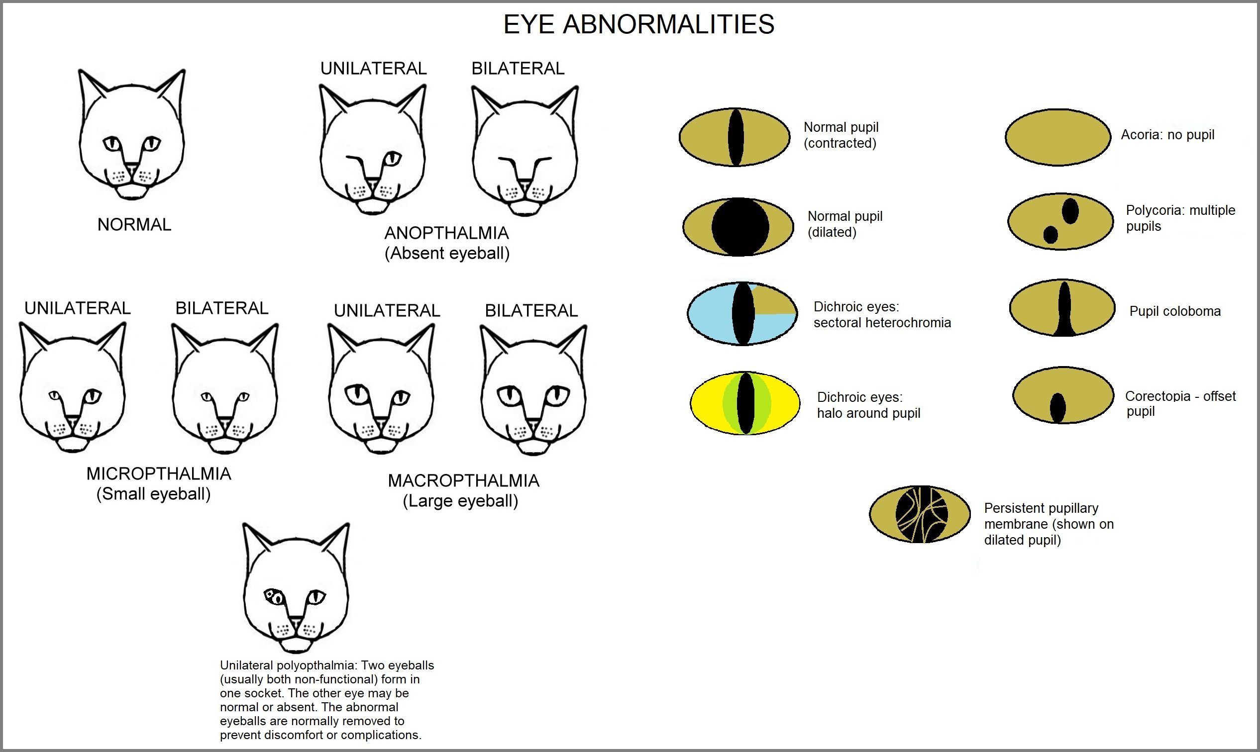Coloboma is an eye condition that occurs when part of the tissue of the eye or eyelid is missing. A gene mutation means the eye doesn't develop normally during pregnancy. It can be hereditary or caused by environmental factors, such as the mother being exposed to chemicals during pregnancy. It can affect one or both eyes. Scientists have identified some of the genes that can cause coloboma. In humans, coloboma can be associated with a mutation in the PAX2 gene and the same genes can also cause anophthalmia and microphthalmia. The gene in cats has not been identified.