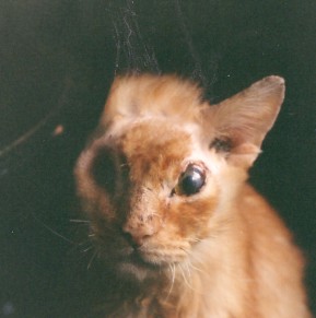 This photo is of 10 year old Ghost (as of 09/2007), who was born without eyeballs. Ghost was found wandering around Seattle with his mother and another kitten a sister to Ghost when he was about 1 month old. They were all taken to a no-kill shelter (which is probably why Ghost wasn't put down immediately). Ghost and the other kitten, Sammie, were both adopted when they were around 2 months old. Having been blind from birth, Ghost copes well with his condition. He is extremely affectionate, demands attention, and acts more like a small lap dog than the average cat. He is also very large at 17 pounds, but is not fat just big! Blind cats compensate with more acute hearing and seem to be more aware of vibrations in the air (perhaps through their vibrissae, or whiskers). Ghost can catch flies out of the air, and loves supervised trips outdoors. Oddly enough, one of his favourite things to do is to sit in the window perhaps to better hear the activities of the outside world. Like most cats, he is a good climber, and loves to explore his environment. His right socket is sometimes a little red and secretes slight amounts of pus, though this doesn't seem to bother him much. His owner, RW Campbell, keeps the socket clean with a damp, warm cloth (much as Ghost hates the procedure), and sometimes his cat-mates will clean Ghost s face for him though Ghost is good about doing it himself. In spite of his somewhat alarming appearance, Ghost is a happy, healthy cat, and not distressed by his empty sockets. Note: Many vets will stitch the eyelids together over an empty socket, to protects the socket and improve the cosmetic appearance of the animal.