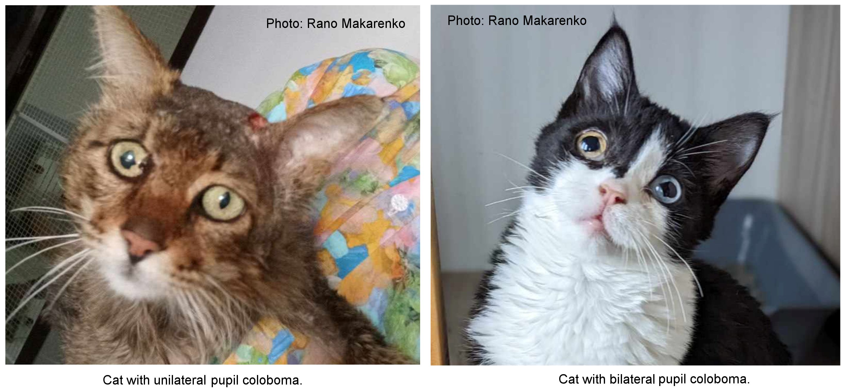 Different types of coloboma affect different parts of the eye: iris, uvea, lens, retina, optic nerve, and/or eyelids. In cats, eyelid coloboma and iris coloboma are the visible forms. Eyelid coloboma appears as a notch in the upper (usually) or lower (less commonly) eyelid. Iris coloboma means part of the iris is missing, making the pupil abnormally shaped. This can cause light sensitivity because the pupil allows too much light into the eye and cannot fully contract. In the 2 cats below (photos by Rano Makarenko) the pupil coloboma looks like notches in the coloured iris.