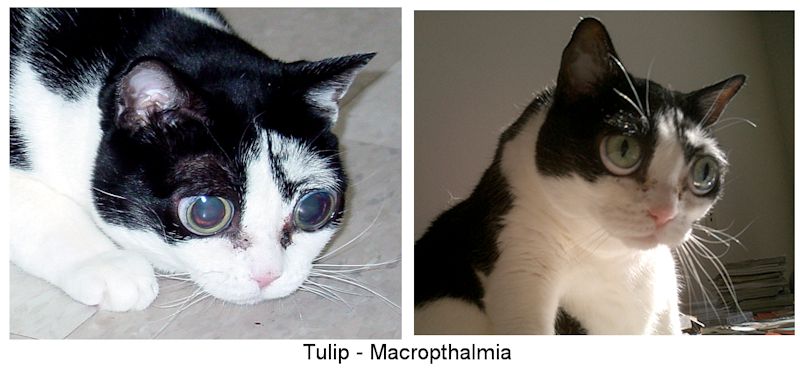 Macropthalmia refers to a condition where either the eyeball(s) or the whole eye(s) is/are abnormally large in size due to anomalous eye development. The lens often detaches (luxation) or there are cataracts and the cat is generally blind. Cats are very stoic and may not show discomfort, but the pressure of grossly enlarge eyballs on surrounding tissue causes discomfort or pain and the eyeball should be removed to alleviate this. The enlarged or protruding eye combined with loss of sight means an increased risk of injury to the eye (and subsequent infection). Macropthalmia can be genetic (as evidenced by 3 affected littermates) or congenital.