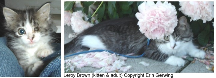 Erin Gerwing sent these details and photos of her cat Leroy Brown who has unilateral microthalmia (tiny eyeball on one side). Erin works at a veterinary clinic where 6 kittens were dropped off after being found abandoned. One kitten died and was found to have only one kidney. Another died of probably FIP. A third, Leroy, was perfectly healthy, but appeared to have a missing eye. The socket was oozing thick pus and the infection started making him generally unwell. During surgery to clear out his eye socket, he was found to have microphthalmia on that side.