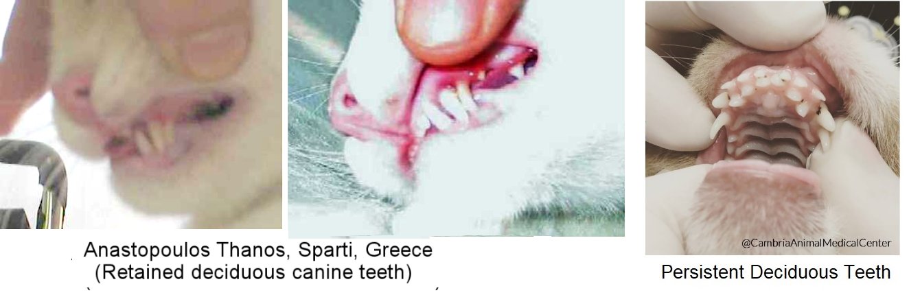 Veterinary dentist’s assistant Denise DeForge in the United States provided additional information about the double canine teeth. In the case of the Sparti cat, this is a common occurrence called "retained deciduous teeth". At about 4 to 5 months of age, the kitten should shed its deciduous (baby) teeth which are pushed out by the permanent adult teeth. Sometimes the two sets of teeth (deciduous and adult) end up are growing side by side, with the thinner, more sharply pointed, tooth being the baby tooth. If the baby tooth doesn’t fall out, it should be extracted to prevent damage to the adult tooth bud which is trying to grow in.