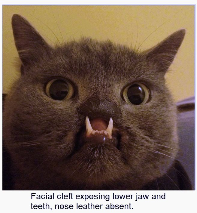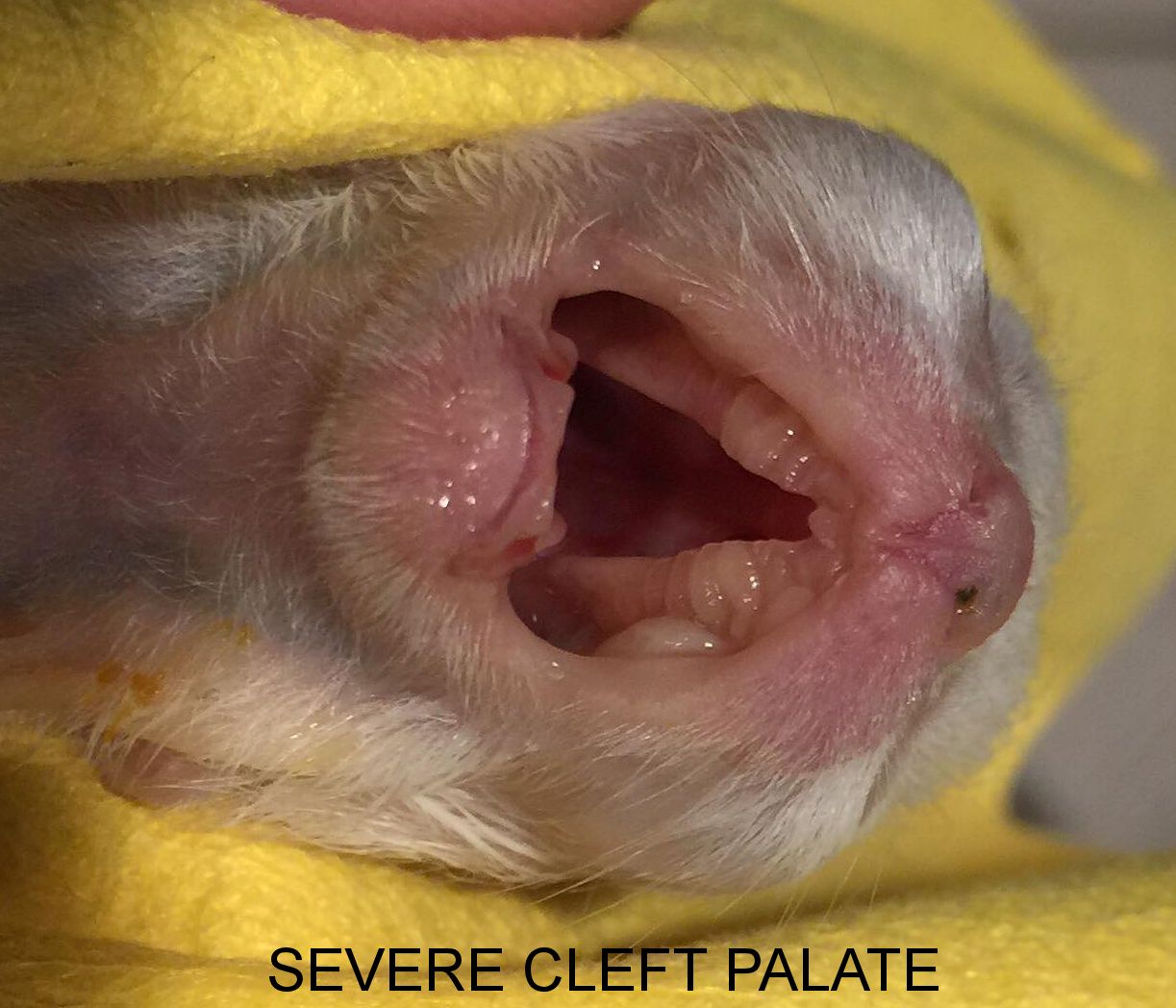 Cleft palate means that the hard and/or soft palate failed to fuse while the foetus was developing. This leaves one or more holes in the roof of the mouth connecting the mouth and nose. The degree of cleft ranges from tiny holes to a large central fissure running from the front to back of the roof of the mouth to the front of the jaw. In severe cases, it also affects the upper jaw line and causes hare-lip. In some cases, the hard and soft palates are completely absent. A hereditary cause is suspected in cats with short, broad faces. Most cleft palate cases appear to be random and are probably due to disruption of foetal development in the womb e.g. the pregnant mother is exposed to drugs, chemicals or radiation, the mother has metabolic disturbances or an infection during pregnancy.