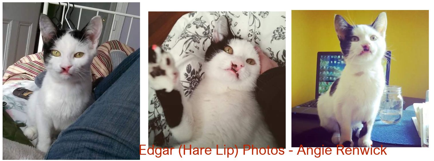 In 2016, Angie Renwick of Ottawa, Ontario, sent these photos of Edgar, a kitten with a hare lip. Sadly Edagar died at 6 months due to FIP. He ate and drank well, but occasionally got water in his "face hole" and would sneeze. Angie cleaned it with a cotton swab and warm water. His teeth came in crooked and pushed to one side, and it's likely some would have had to been removed had he lived to adulthood. Angie adopted him at 12 weeks from a rescue in Smiths Falls, Ontario. He was born to a barn cat and had at least one sister, apparently completely normal. He was a bit shy, but very sweet and popular at his vet's office where everyone always wanted to meet him and get a look at his funny face.