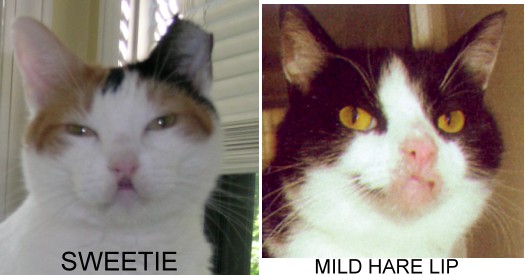 Susanne Farrar in central Arkansas, USA, provided this photo of 4 year old Sweetie who has hare lip, but no cleft palate. Sweetie was adopted from a shelter (the clipped ear was done erroneously by a vet marking her as a neutered feral).
