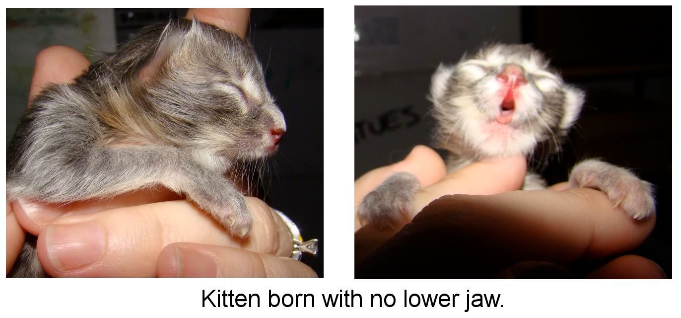 The prognosis for kittens born with an incomplete or absent lower jaw (mandible) is very poor. They cannot suckle properly. It is possible to tube feed the kitten, but it would have difficulty eating solid food later on. If enough of the jaw is present it might be possible to repair it once the kitten is old enough. It depends on whether enough bone is present to create a functioning mandible that allows the cat to eat normally. If the jaw is completely absent, euthanasia is recommended.