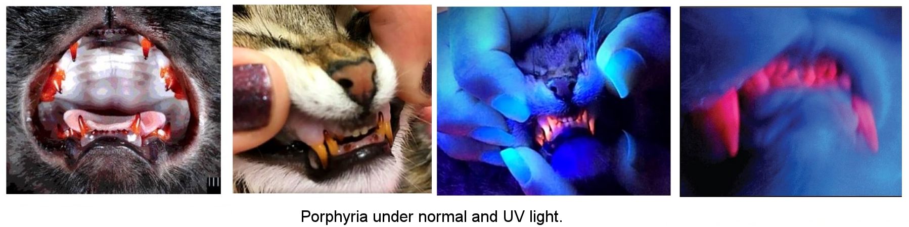 Porphyria is a hereditary disease where there is abnormal metabolism of the blood pigment haemoglobin. Porphyrins are excreted in the urine, which becomes dark, and the teeth and claws are red and glow under UV light. Cutaneous porphyria, Erythropoietic Porphyria (Gunther's disease) and Intrmittent Porphyria have been seen in cats.