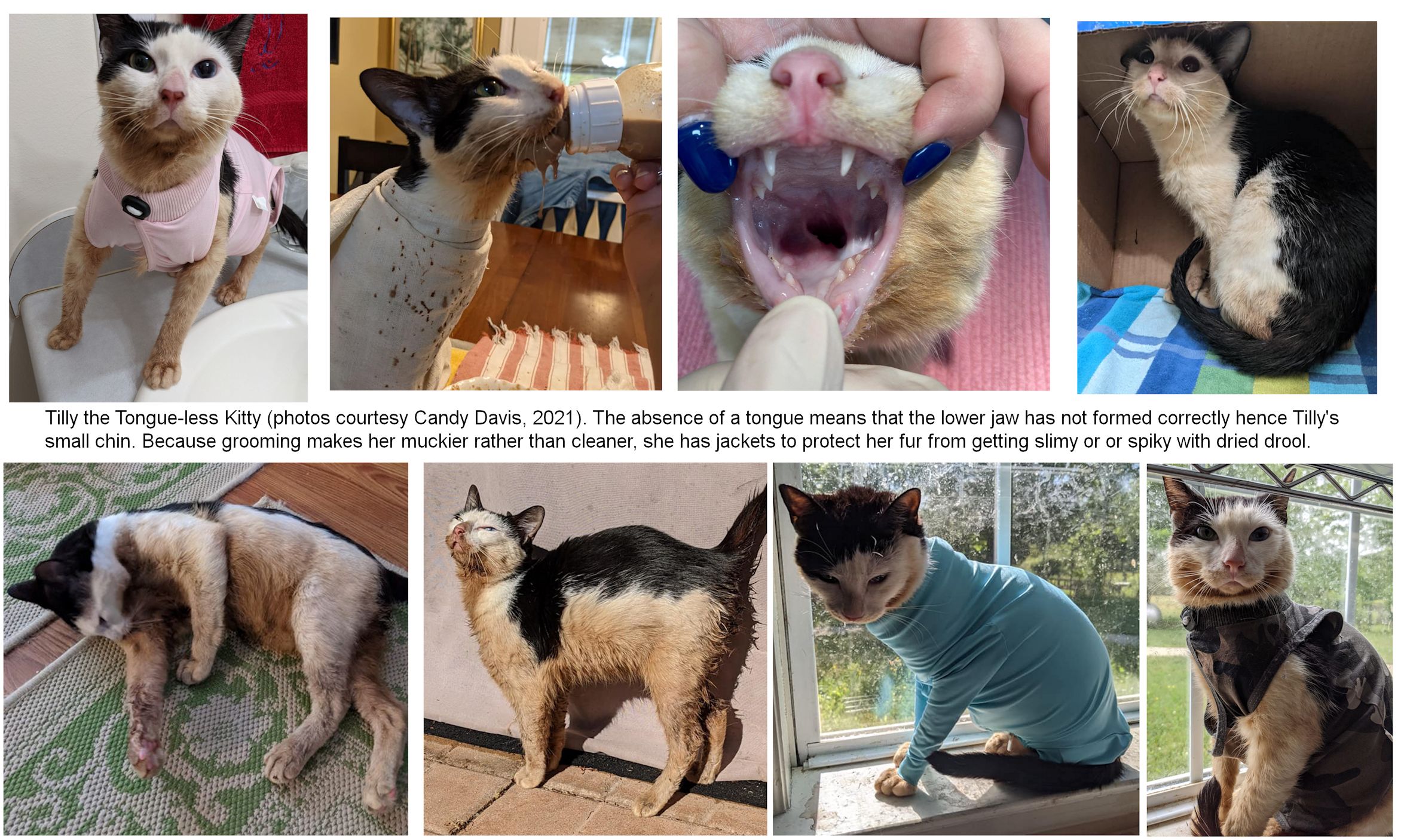 Up until 2021, I knew of only one case of a cat born without a tongue and there were very few details available. It survived to adulthood (I have no information, but assume syringe or tube feeding was required to compensate for suckling problems). As an adult, it drinks by sucking water rather than lapping, though it finds a rabbit's water bottle easier to use than a bowl. It is able to eat mashed soft food. Absence of the tongue means it cannot groom itself and is liable to become unkempt. Its owners compensated by grooming the cat with a damp cloth.
